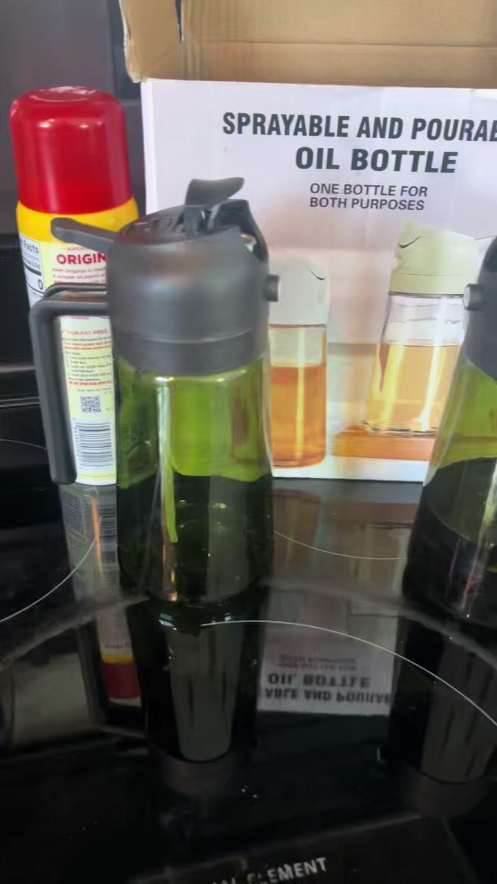 Dual-mode nozzle: Quick press = fine mist (air fryer) / Slow press = steady stream (grilling)