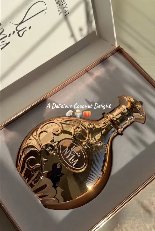 A rose-gold gilded carved bottle holds a sensory journey: bright top notes of coconut and peach nectar, a lush floral heart of tiare blossom, and a warm sandalwood-heliotrope base. Youthful sweetness meets sophisticated depth – artisanal design, timeless allure.