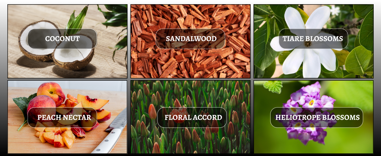 TOP - Fruity Accord, Coconut, Peach Nectar HEART - Floral Accord, Tiare Blossoms BASE - Sandalwood, Heliotrope Blossoms
