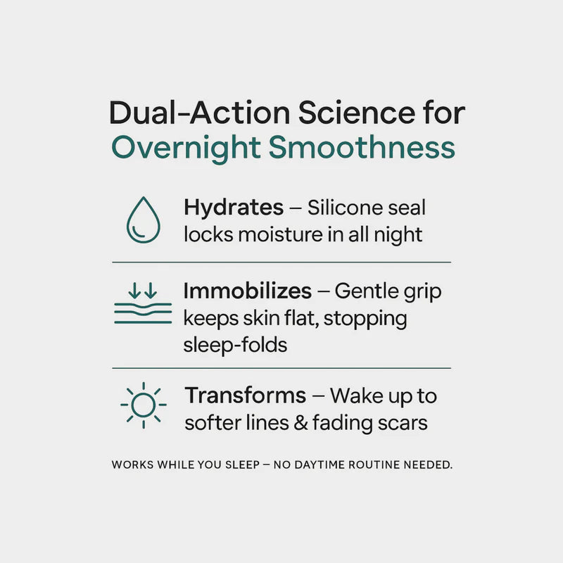 Our medical-grade silicone forms an occlusive seal that traps twice the moisture, plumps skin toprevent nighttime folding, andcreates a collagen-boosting micro-climatethat steadily softens lines and fades scars.
