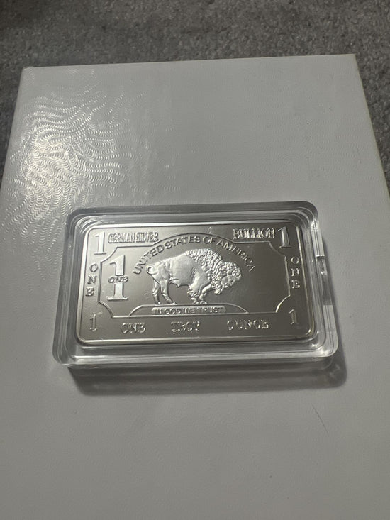 The bar’s front showcases a detailed bison at center, surrounded by inscriptions:“German Silver”,“United States of America”,“Bullion”,“One Troy Ounce”, and“In God We Trust”. The layout is rich with thematic detail, honoring the buffalo’s role in frontier lore.