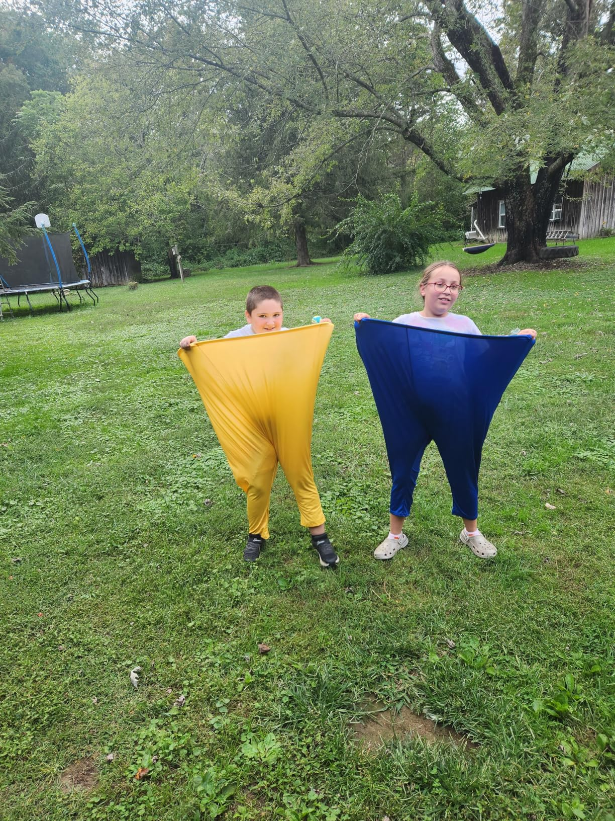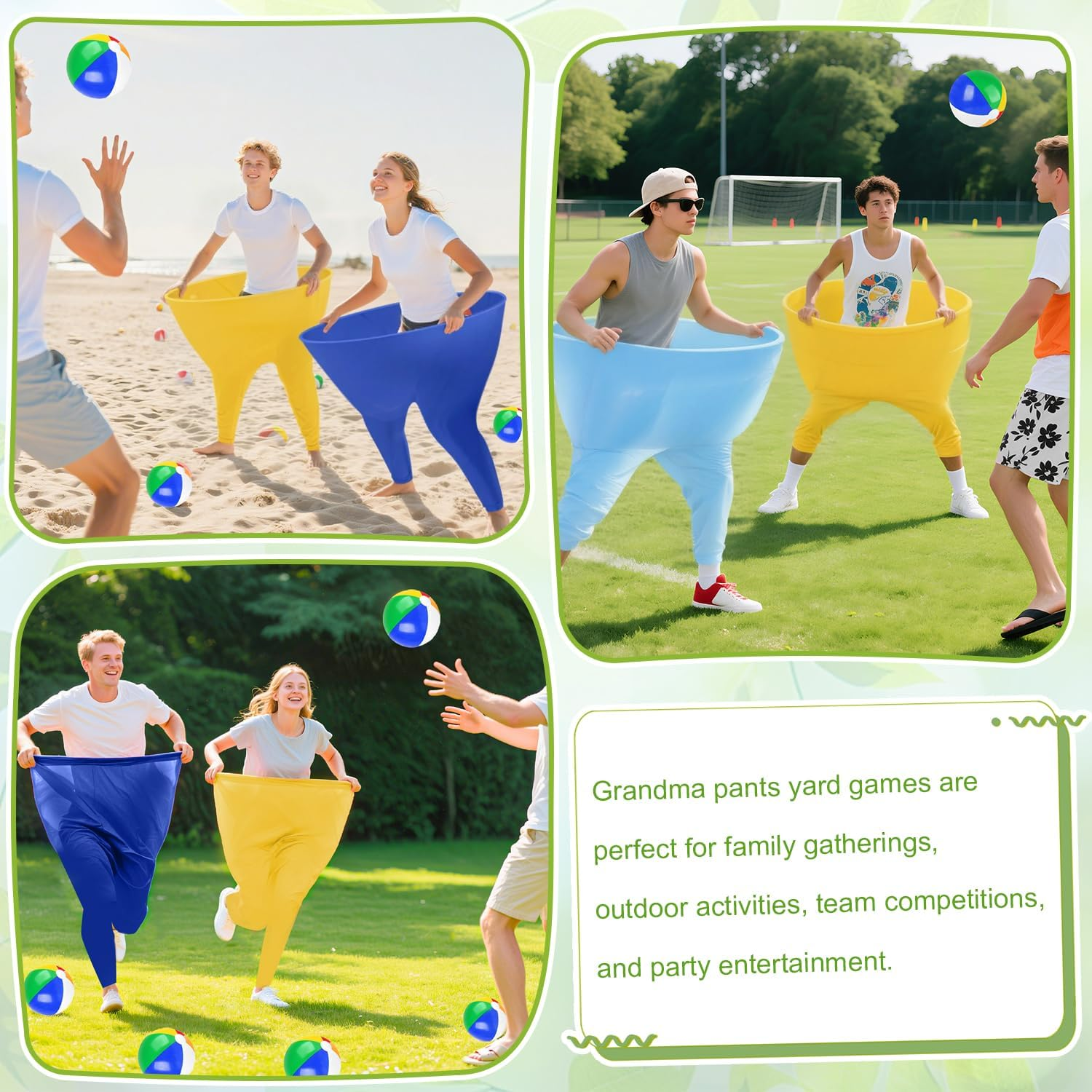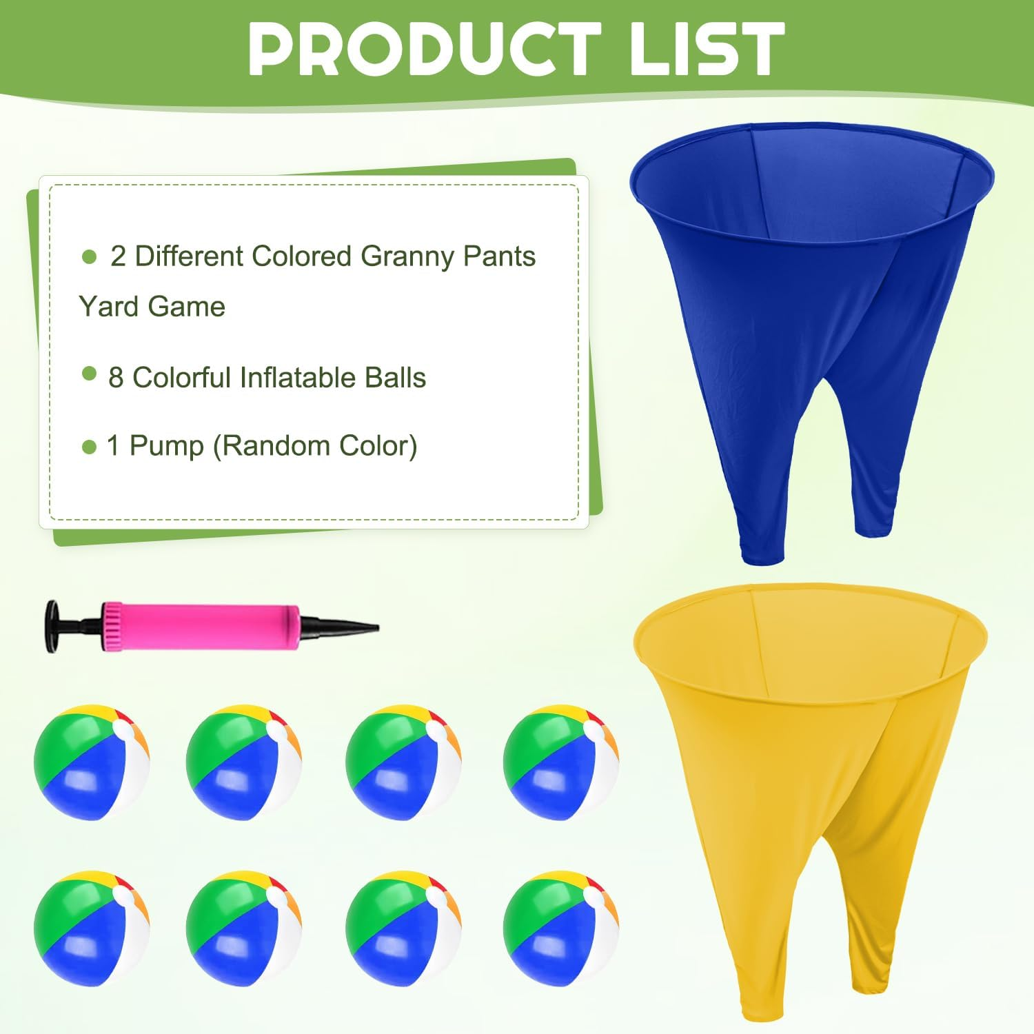 Our granny pants outdoor game includes 2 pack of 31.2inch (D) x 42.2inch (H) mix colors granny pants, 8 colorful inflatable balls and 1 air pump (random color). It is perfect for team competitions and party entertainment and an ideal choice for family gatherings.