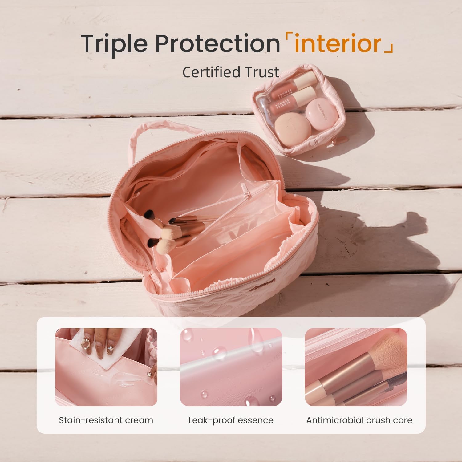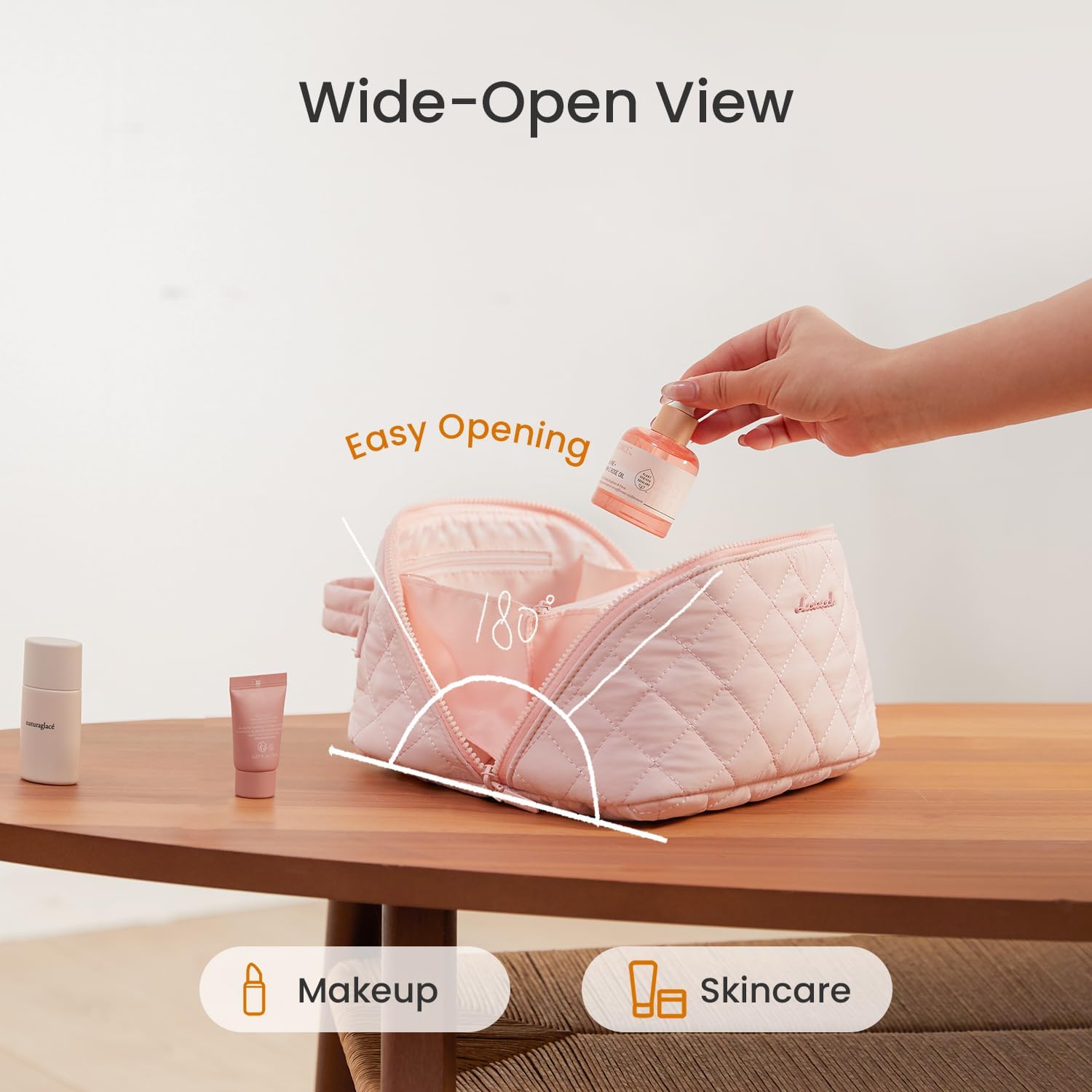 spacious large makeup bag for women opens fully to a 180° lay-flat design, featuring 5 dedicated compartments to store all makeup and skincare essentials. Store 5+ brushes, 200ml toners, eyeshadow palettes, and full skincare routines. The wide-open view ensures quick access to all essentials, making it the ultimate makeup organizer for travel or daily use.