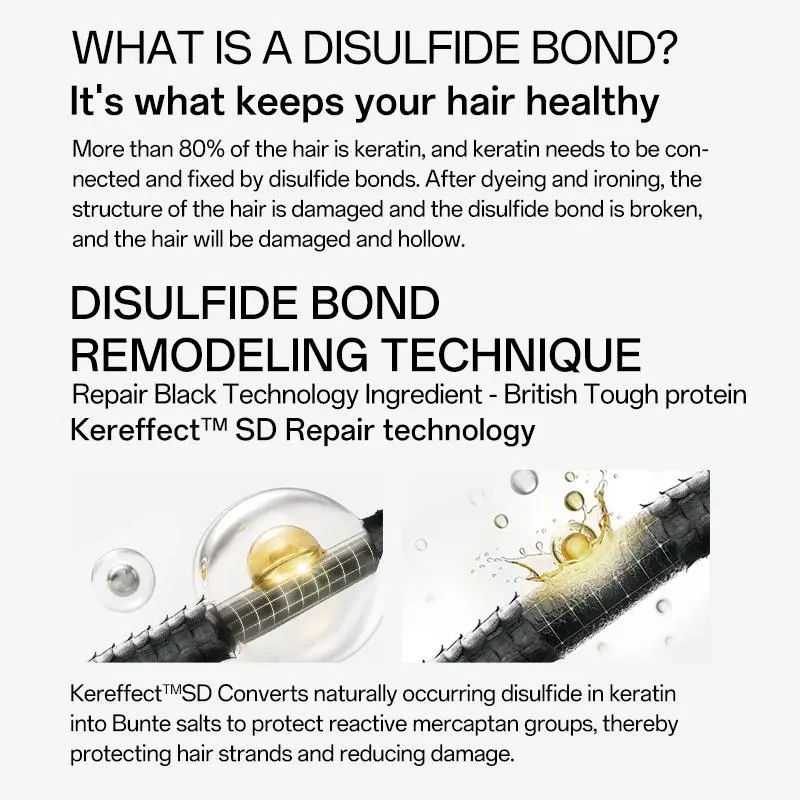 Disulfide Bond Reshaping Technology strengthens hair strands post-dye or perm. The British Tough Protein Kereffect TMSD converts keratin's disulfide bonds, protecting active sulfide groups and reducing damage. This technology rebuilds damaged bonds, preventing breakage. Trust Bracurve for cutting-edge hair care solutions.