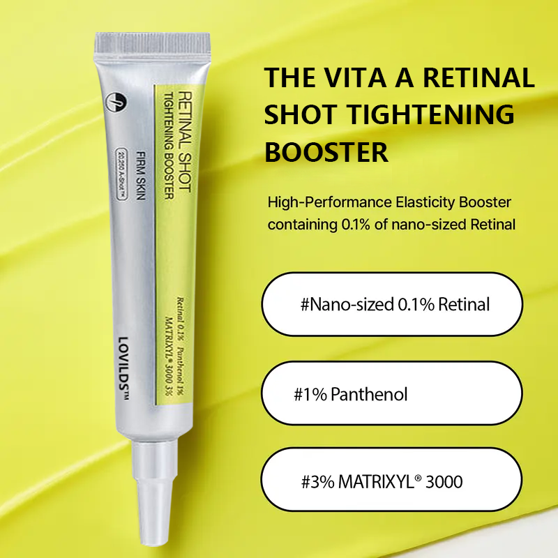 Celimax The Vita A Retinol Shot Tightening Booster is an innovative skincare product containing liposomized retinal and Matrixyl, designed to address skin concerns such as wrinkles, uneven texture, and enlarged pores. Combined with A-Shot™ technology, it enhances the delivery of these ingredients.