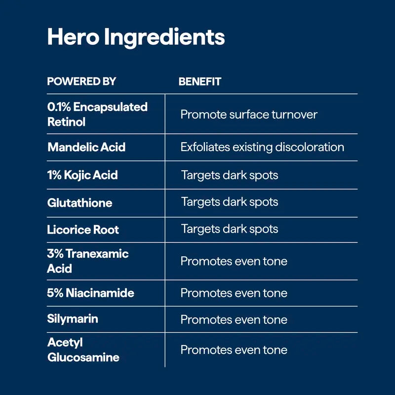 Our dermatologist-formulated treatment addresses the root cause of dark spots and helps prevent and treat them at every stage. Retinol and mandelic acid help clear up existing spots, while the rest of our super-stacked formula helps prevent new ones from forming.