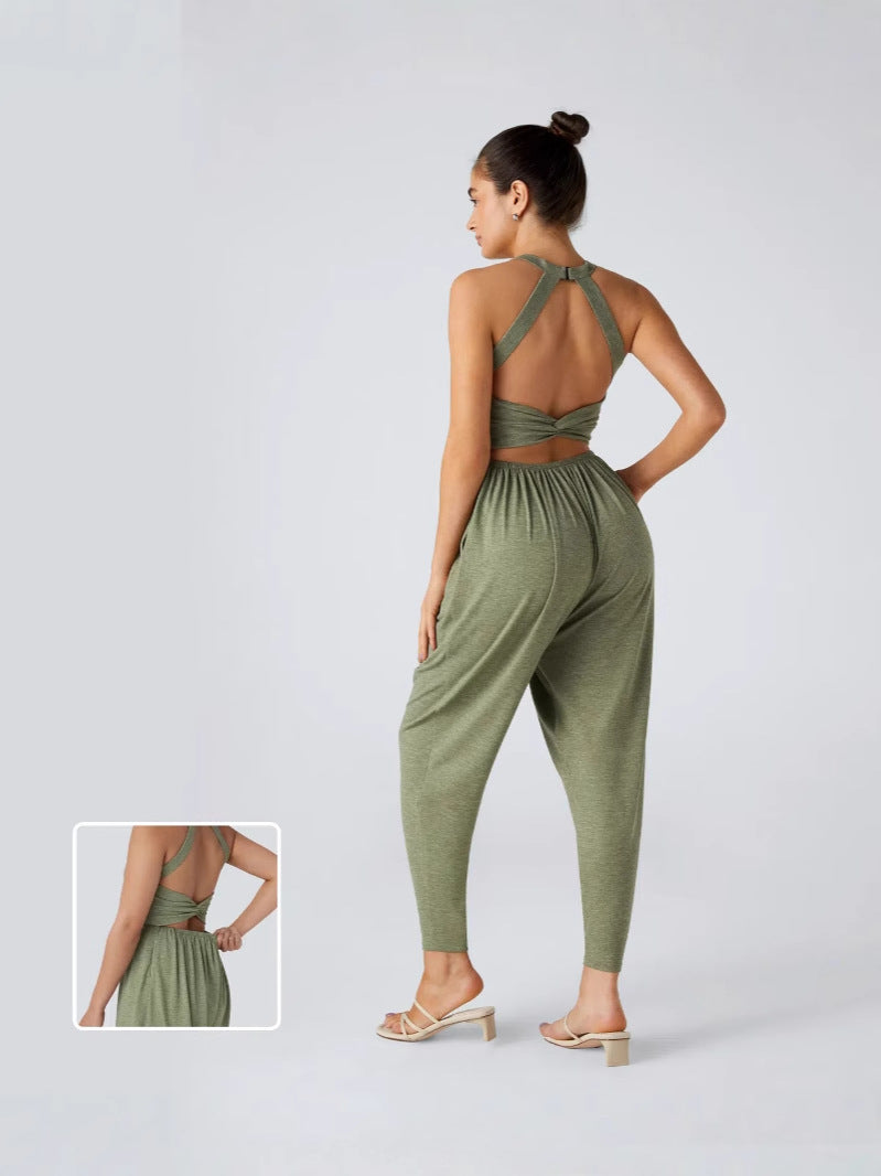 🌿 Design Highlights:✔Minimalist front: U-neck + loose harem pants for a flattering silhouette