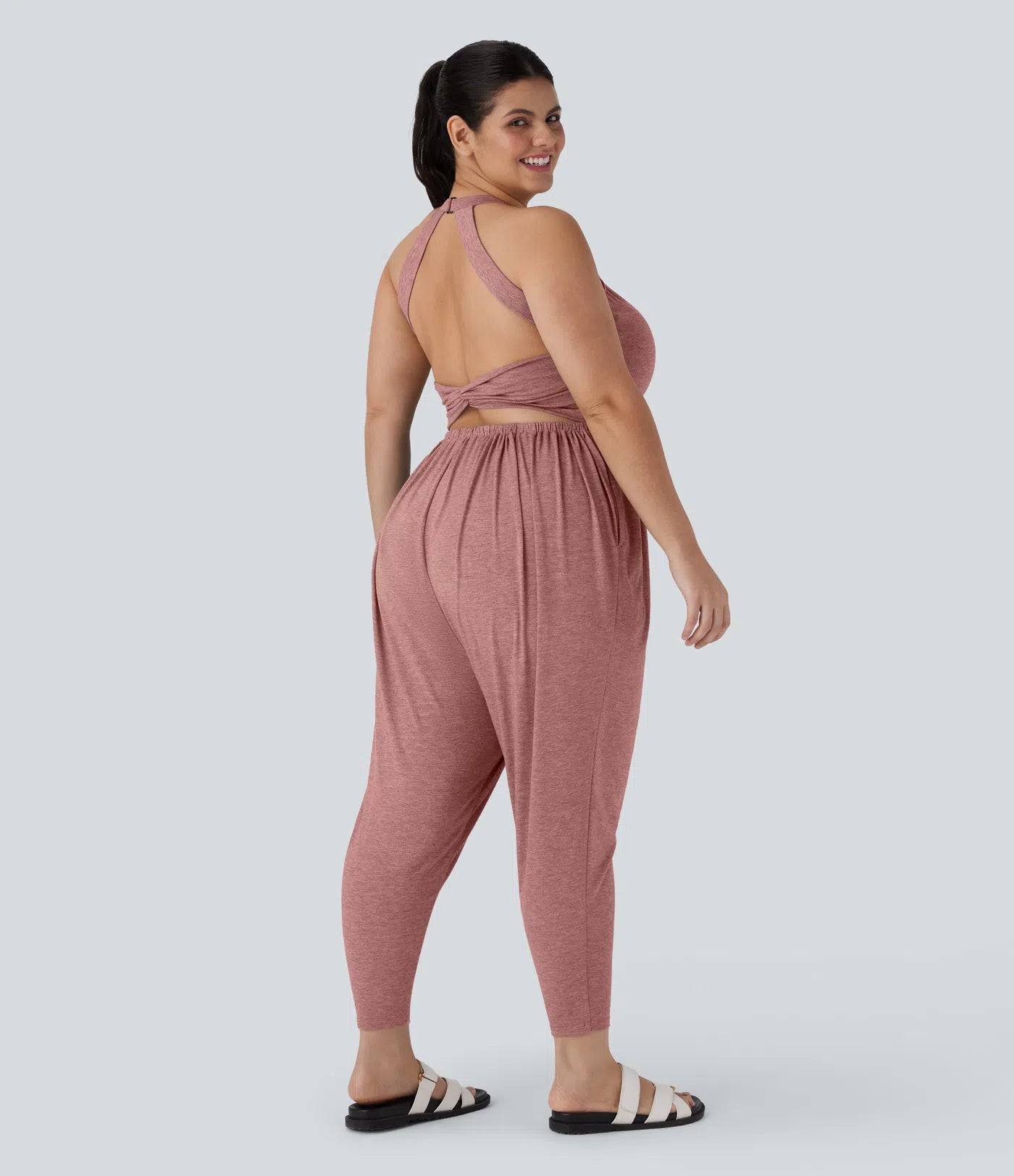 ✨ Effortlessly Chic with a Hint of SexyThisU-neck pocket harem jumpsuitfeatures acrisscross open back design, adding a flirty touch to its relaxed comfort! Theadjustable back tieat the waist lets you customize coverage—wear it modest for daily outings or show some skin for vacation vibes.