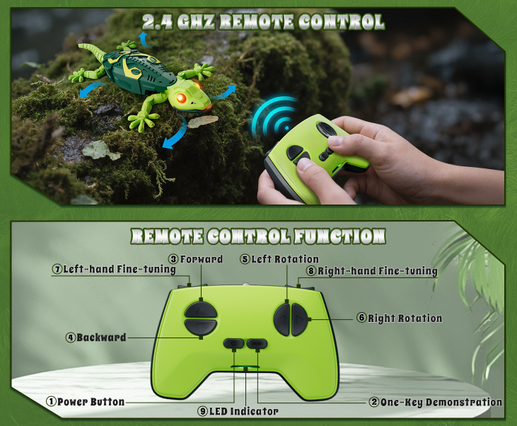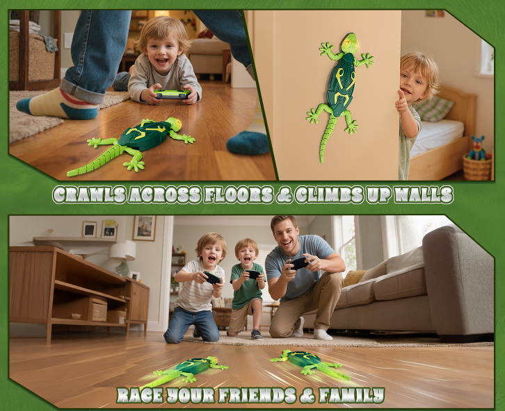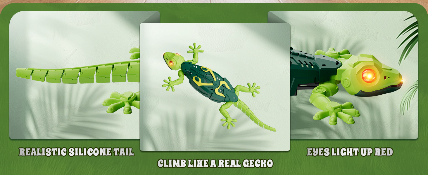 remote-control gecko features glowing LED eyes, a soft silicone tail, and lifelike limb movements—just like a real gecko! Watch it scurry across floors and climb walls with astonishing realism.